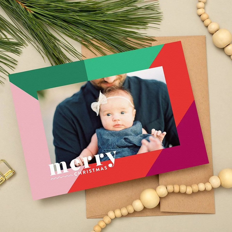 A new and unique trend we are seeing in cards this year is geometric color blocking. If you’re looking to break from the mould this season, look no further. This design trend ditches every classic holiday theme. Straying away from typical wintery scenes, the style uses large geometric shapes including triangles, circles, and rectangles to give off a modern vibe. Additionally, say goodbye to visions of red and green as these designs are often filled with bright and bold primary colors.