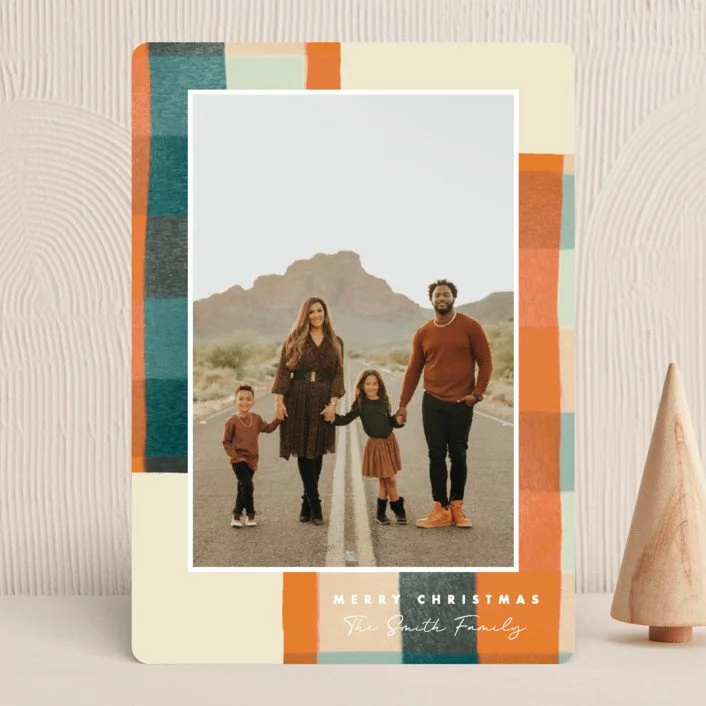 Returning to the holiday card scene this year are patterns of plaid and flannel. As always, buffalo plaid will be a popular choice, but we are starting to see the emergence of other color schemes including greens, blues, oranges, and golds. Give your card a cozy and festive feel this year by using a plaid or flannel pattern as a background choice or photo framing element.